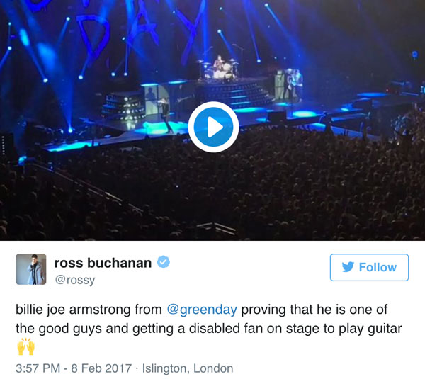 Green Day frontman Billie Joe Armstrong invited a disabled fan to join the band onstage to play guitar at their concert in London on Feb. 8. It is a tradition for the band to invite an audience member to perform with them but this special occurrence stuck out to fans as a touching, heartfelt moment.