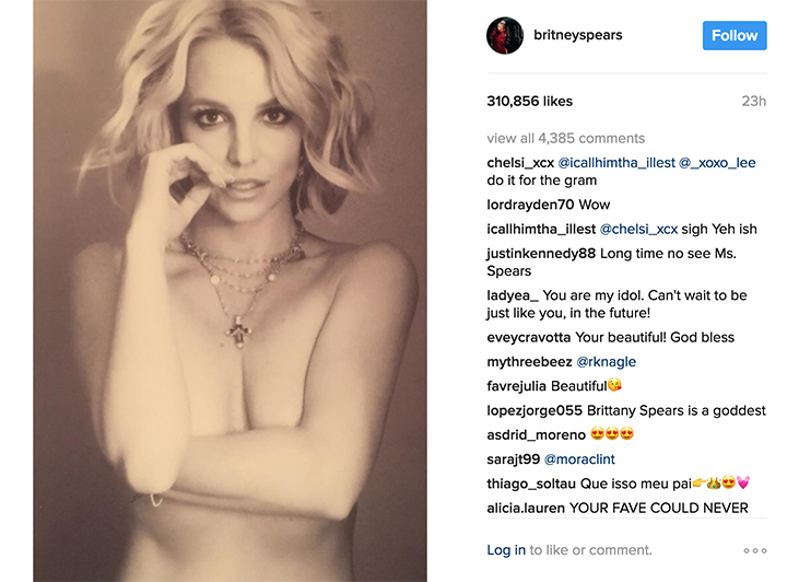Britney Spears gave her 15 million followers on Instagram some sepia-toned loving on Sunday sharing a topless photo of herself.