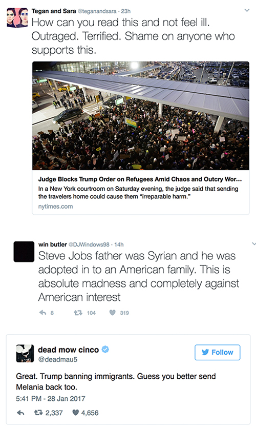 Jann Arden took to Twitter to ask Trump: “How can you NOT help refugees? Most of your terror comes from YOUR heart.” EDM star deadmau5 suggested: “Guess you better send Melania back too.”