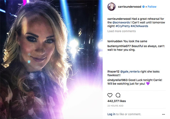 Carrie Underwood shared a close-up selfie on Instagram during rehearsals for Sunday night's ACM Awards – and the country star looked fresh and fully recovered from her accident last year.