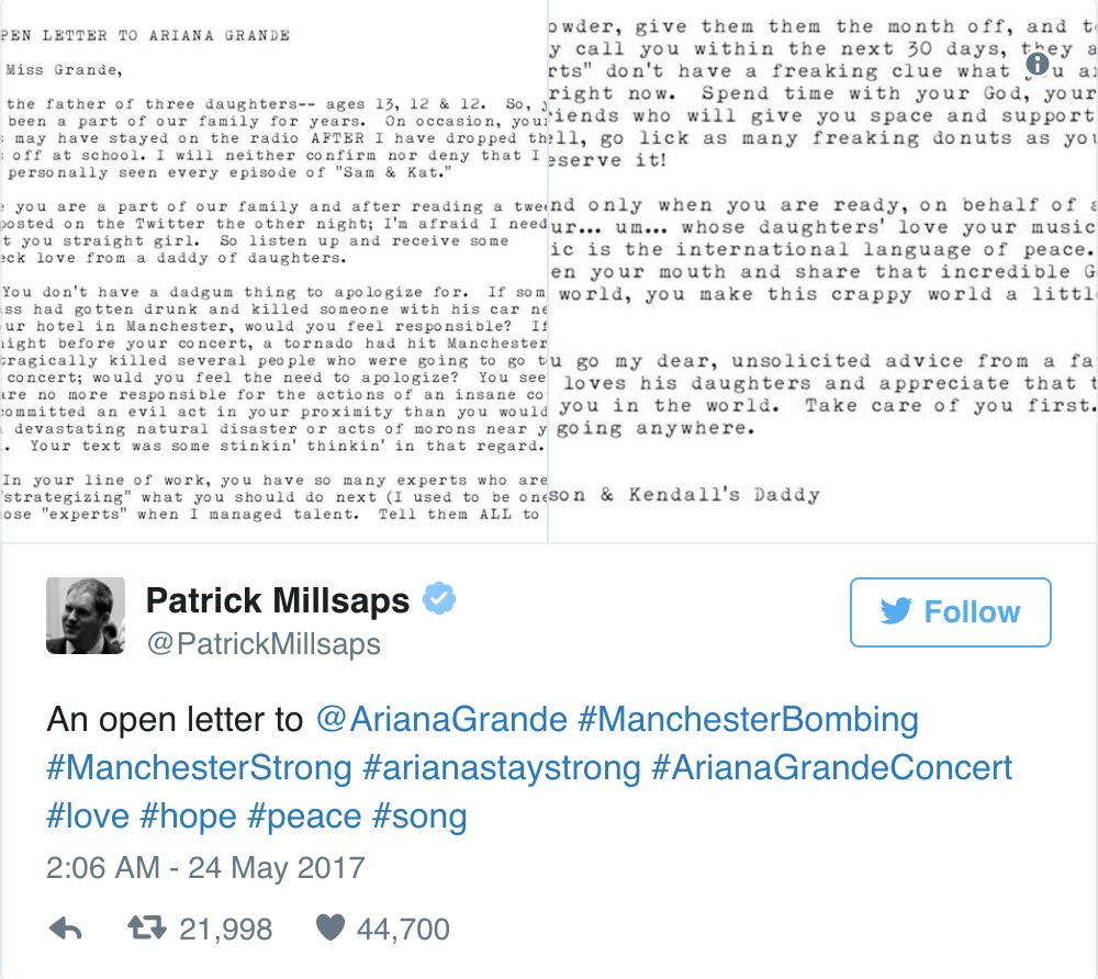 Following Monday's bombing at Ariana Grande's concert in Manchester, which killed 22 people and injured at least 60 others, we can't even begin to think about how the pop star might be feeling. A sweet letter from a father of three young girls is making the rounds, and might help heal the 23-year-old star's heart just a bit.