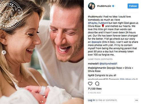 Florida Georgia Line’s Tyler Hubbard and wife Hayley welcomed their daughter, Olivia Rose, on Saturday in Nashville.