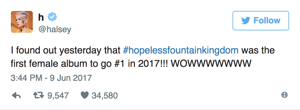 “I found out yesterday that #hopelessfountainkingdom was the first female album to go #1 in 2017!!! WOWWWWWWW,” the singer posted on Twitter.