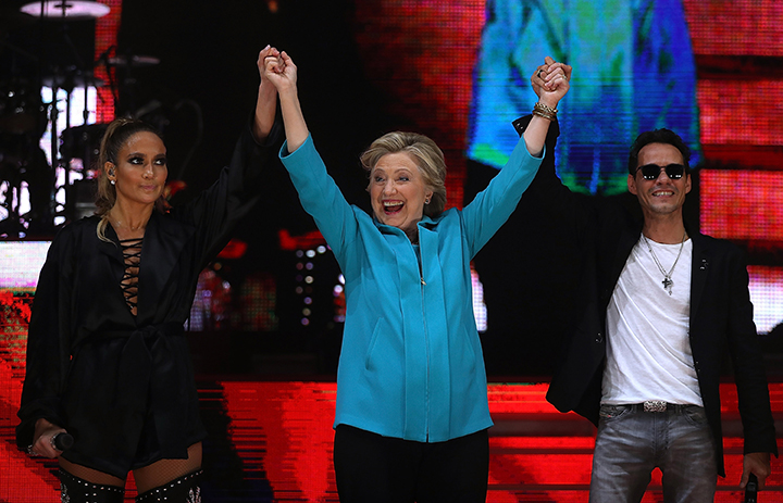 Hillary Clinton got a big boost Saturday night in Miami from superstar Jennifer Lopez, who performed for thousands of rain-drenched fans.