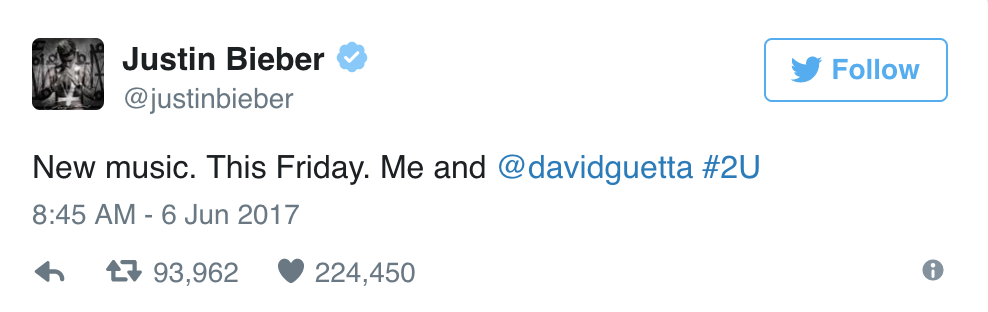 On Tuesday morning (June 6), the 23-year-old entertainer took to Twitter to announce the collaboration, which has since been teased during club appearances. Interestingly enough, the news around "2U" comes just months after the Guetta signed with the Biebster's longtime manager Scooter Braun, who helped Ariana Grande orchestrate her One Love Manchester benefit show on Sunday.