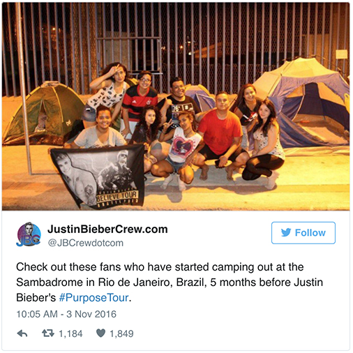 According to Brazilian news outlet Globo (via Time), dozens of Justin Bieber fans have already set up camp outside of Rio de Janeiro’s Sambadrome venue where the pop singer is expected to take the stage in March 2017, and others have already started to gather at the São Paulo venue for a show in April.