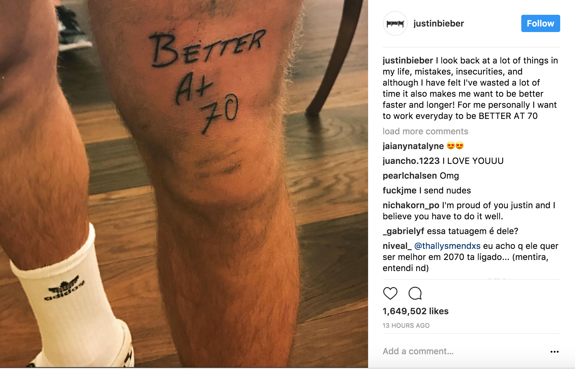 Justin Bieber got some new ink! The “Despacito” singer revealed his new tattoo on Instagram Friday (June 16). It says “Better at 70” and appears on his left thigh.
