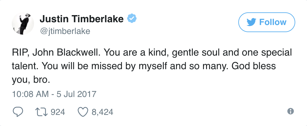 Justin Timberlake's mourning the loss of Prince's drummer, John Blackwell Jr, who he worked with in 2006 following the release of FutureSex/LoveSounds. On Wednesday (July 5), he took to Twitter to share his condolences for the late musician. He was 43 years old.
