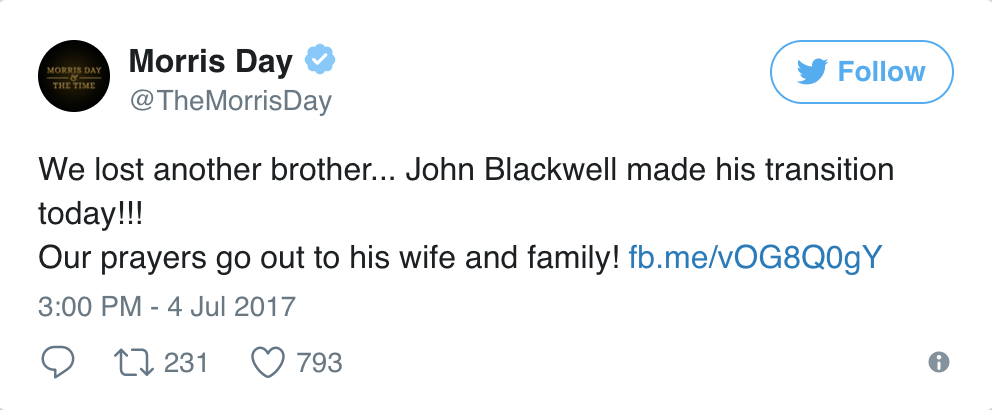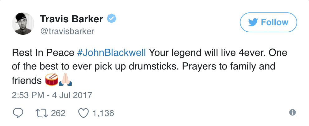 "RIP, John Blackwell. You are a kind, gentle soul and one special talent. You will be missed by myself and so many," he wrote of his former collaborator, adding, "God bless you, bro." Word of Blackwell's passing surfaced on Tuesday via his wife, Yaritza, who revealed that he died peacefully in her presence after losing his battle with a brain tumour. "Thanks God for his life and thanks everyone for their support," she wrote in an Instagram post.