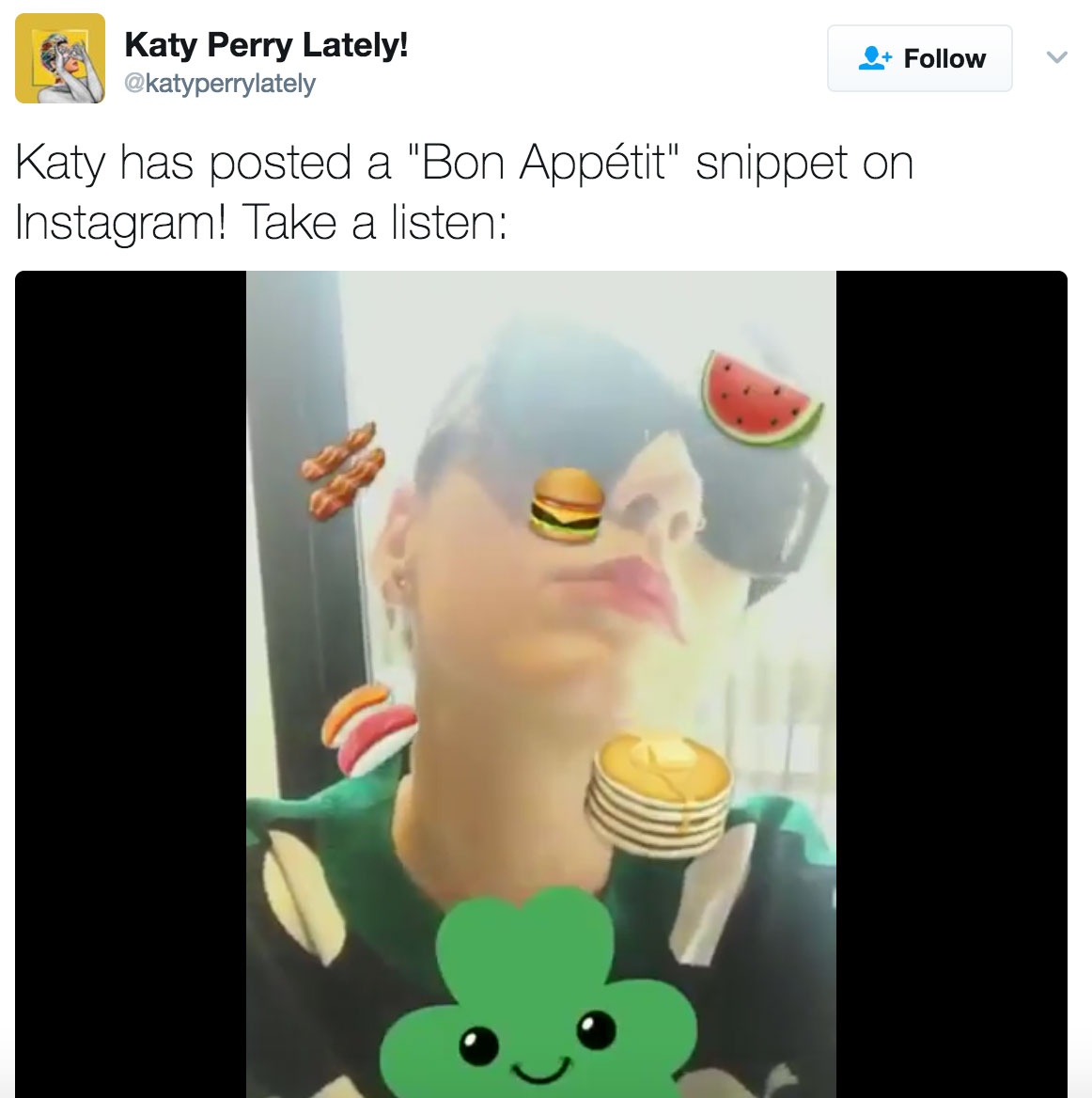 While “Chained to the Rhythm” has racked up over 100 million streams on Spotify, Katy Perry has been busy teasing fans with new music. Yesterday (Mar. 17), the pop star played a snippet of a song titled “Bon Appétit” on her Instagram story.
