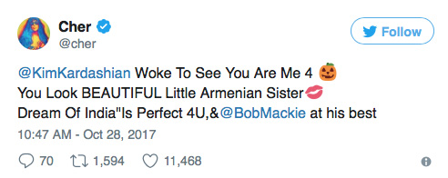 “Woke To See You Are Me 4 [Halloween]. You Look BEAUTIFUL Little Armenian Sister. Dream Of India Is Perfect 4U, & @BobMackie at his best” Cher replied.