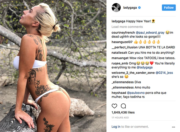 “Happy New Year” the pop singer captioned another post, wearing the same bikini and revealing her collection of tattoos. The iconic David Bowie piece on her ribcage is the most prominent, which she braved two days before her tribute performance for the late legend at the 2016 Grammy Awards.