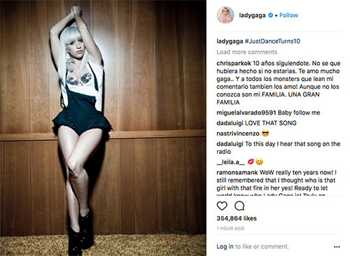 To celebrate her first decade of success, Gaga posted some throwback photos on Instagram from her debut with the caption “#JustDanceTurns10.”