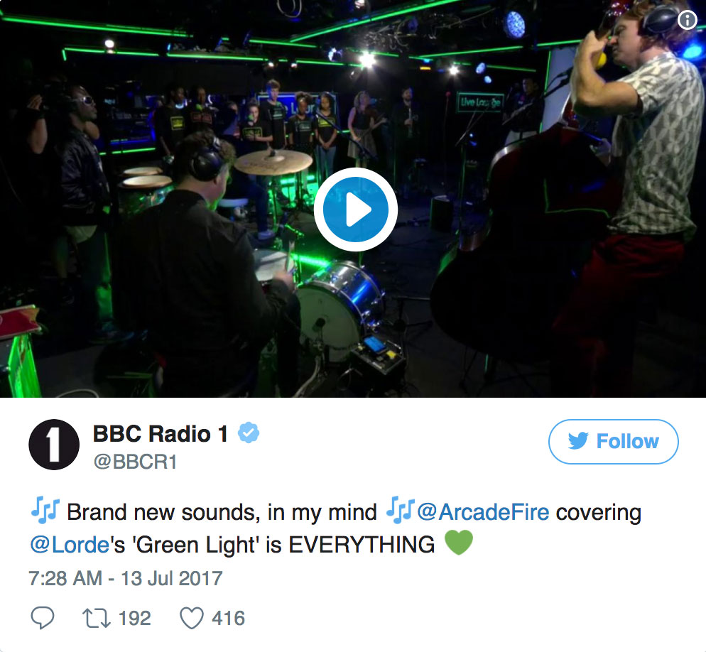 Canadian rockers Arcade Fire have covered Lorde’s popular hit “Green Light” during a BBC Radio 1 Live Lounge performance on Thursday (July 13).