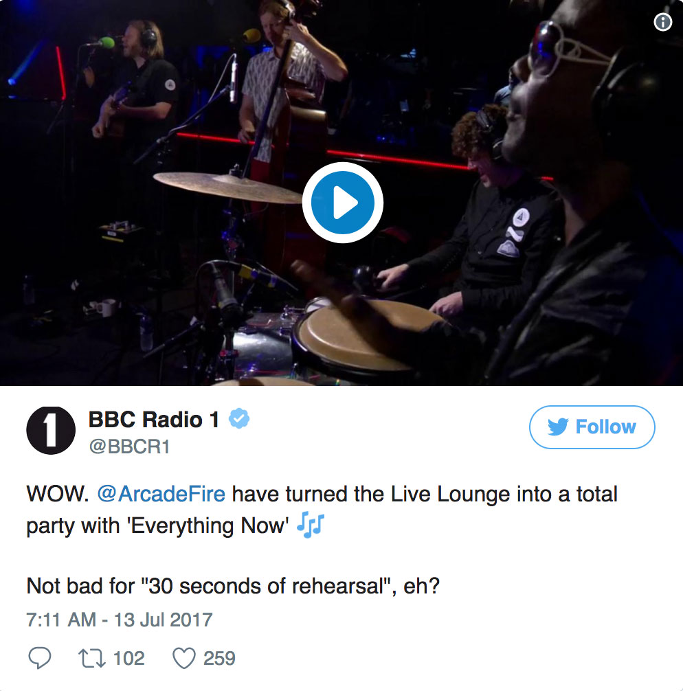 Shortly after they wrapped on the Live Lounge, Arcade Fire dropped a new song, “Electric Blue”.