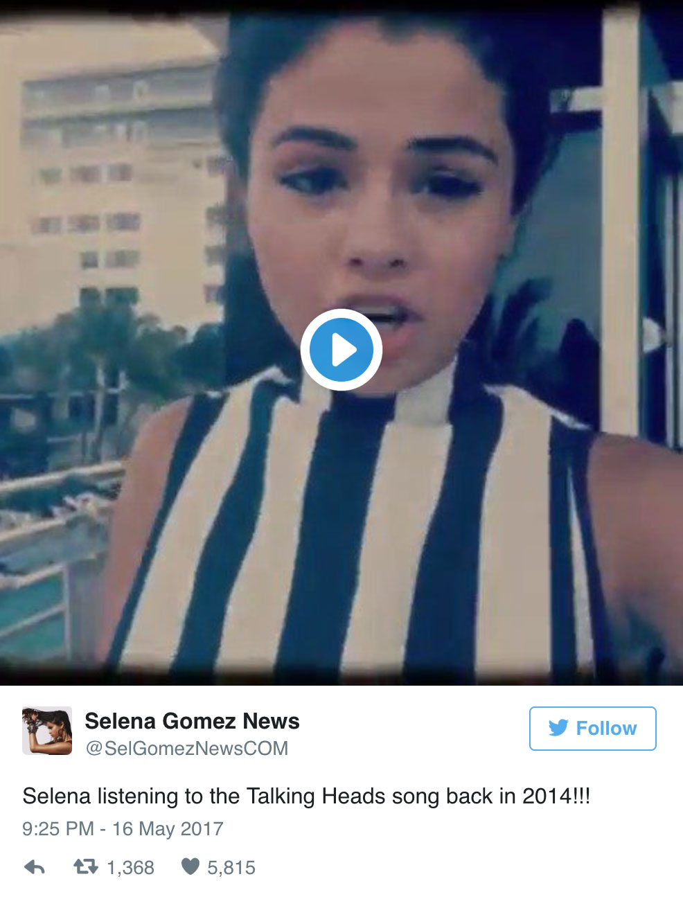 In fact, this week Selena's fans found a video of the singer listening to Talking Heads back in 2014. In the video, she says, "Miami playing Talking Heads, that seems to be fate."