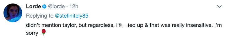 On Monday, Lorde tweeted that she never actually mentioned Swift by name but “regardless, I f***ed up & that was really insensitive. I’m sorry.”