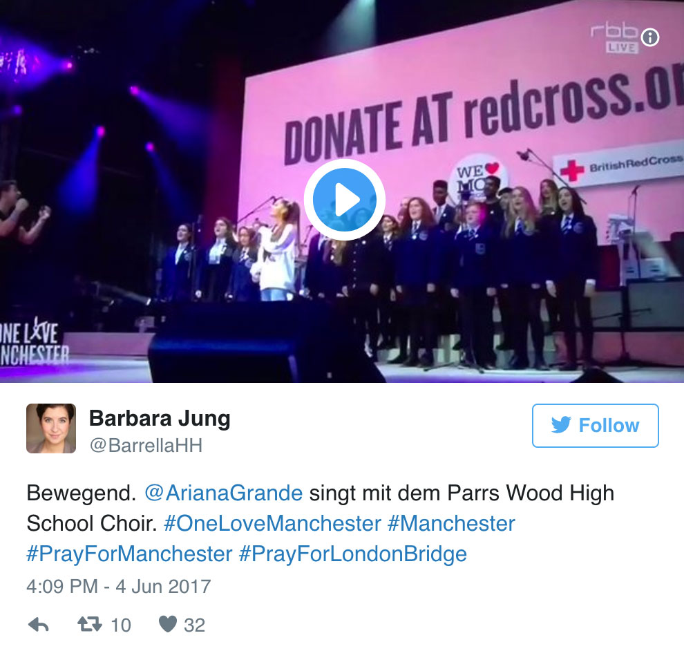 Emotions were at an all-time high when Ariana Grande teamed up with a Manchester high school for a collaborative performance of "My Everything" during One Love Manchester, the star's memorial concert on Sunday (June 4) in honour of those lost during the May terror attack.
