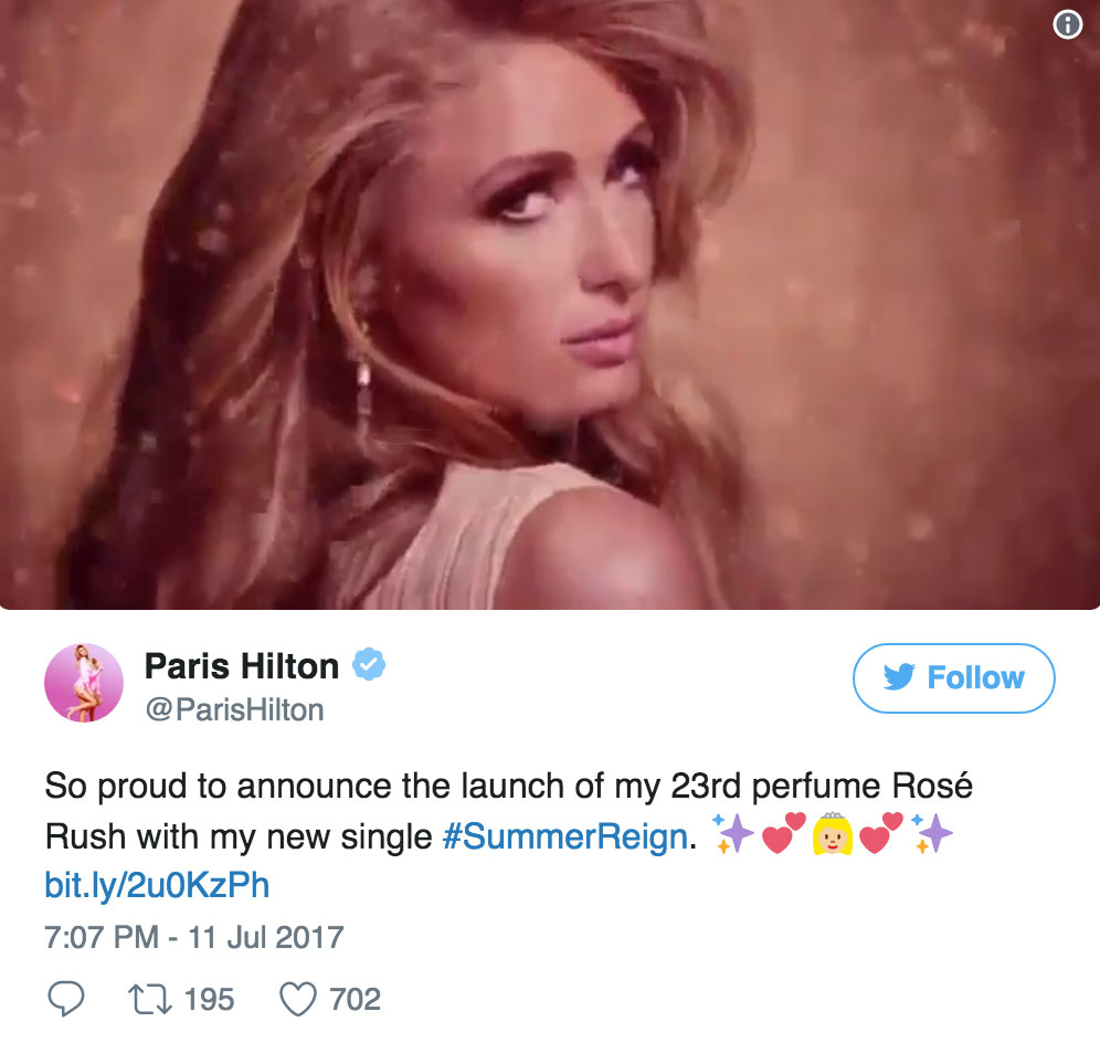 “So proud to announce the launch of my 23rd perfume Rosé Rush with my new single #SummerReign,” the 36-year-old tweeted, along with a snippet of the song.