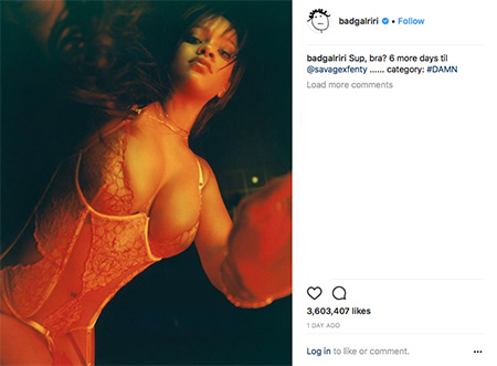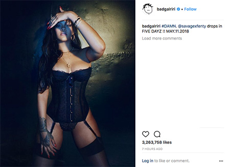 “#DAMN,” the “S&M” singer captioned the post, while posing in a black corset and garters. “@savagexfenty drops in FIVE DAYZ !! MAY.11.2018”