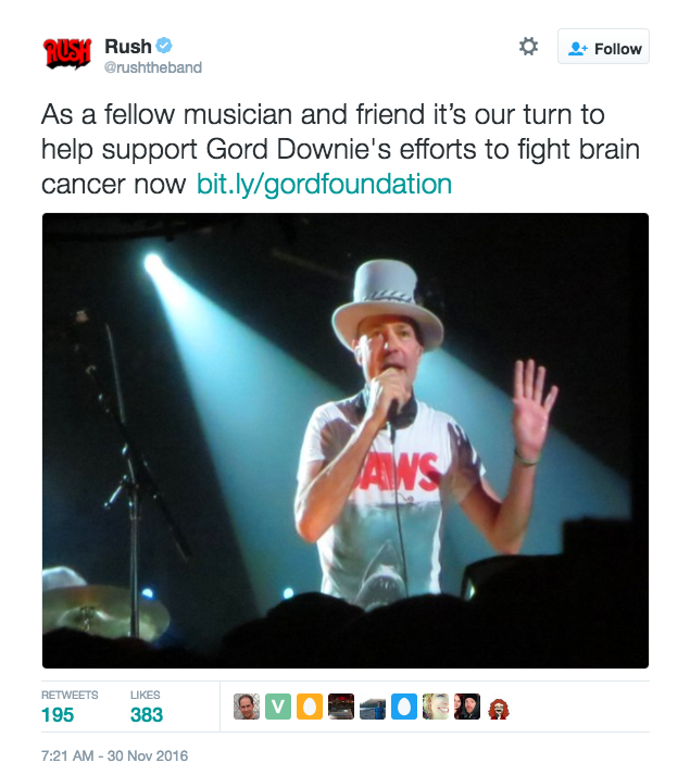 This donation will be given to the Sunnybrook health Sciences Center which is where the Gord Downie Fund for Brain Cancer Research is based. Rush is being awarded a Canadian Music Week Award which can be given to the charity of their choice: