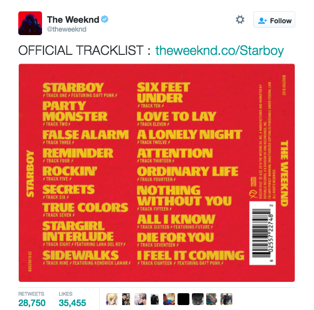 After having brought up our excitement with a first collaboration with Daft Punk on Starboy, then dropping a jaw-dropping video for "False Alarm," planning a menswear collection with H&M, all the while making calculated appearances here and there, The Weeknd now drops his tracklist for the upcoming album, Starboy.