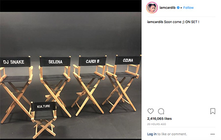 Cardi B also shared a comedic behind-the-scenes photo on her Instagram, captioning it: “Soon come ;) ON SET!” displaying the artists’ chairs, complete with one mini seat for her 2-month-old daughter, Kulture.