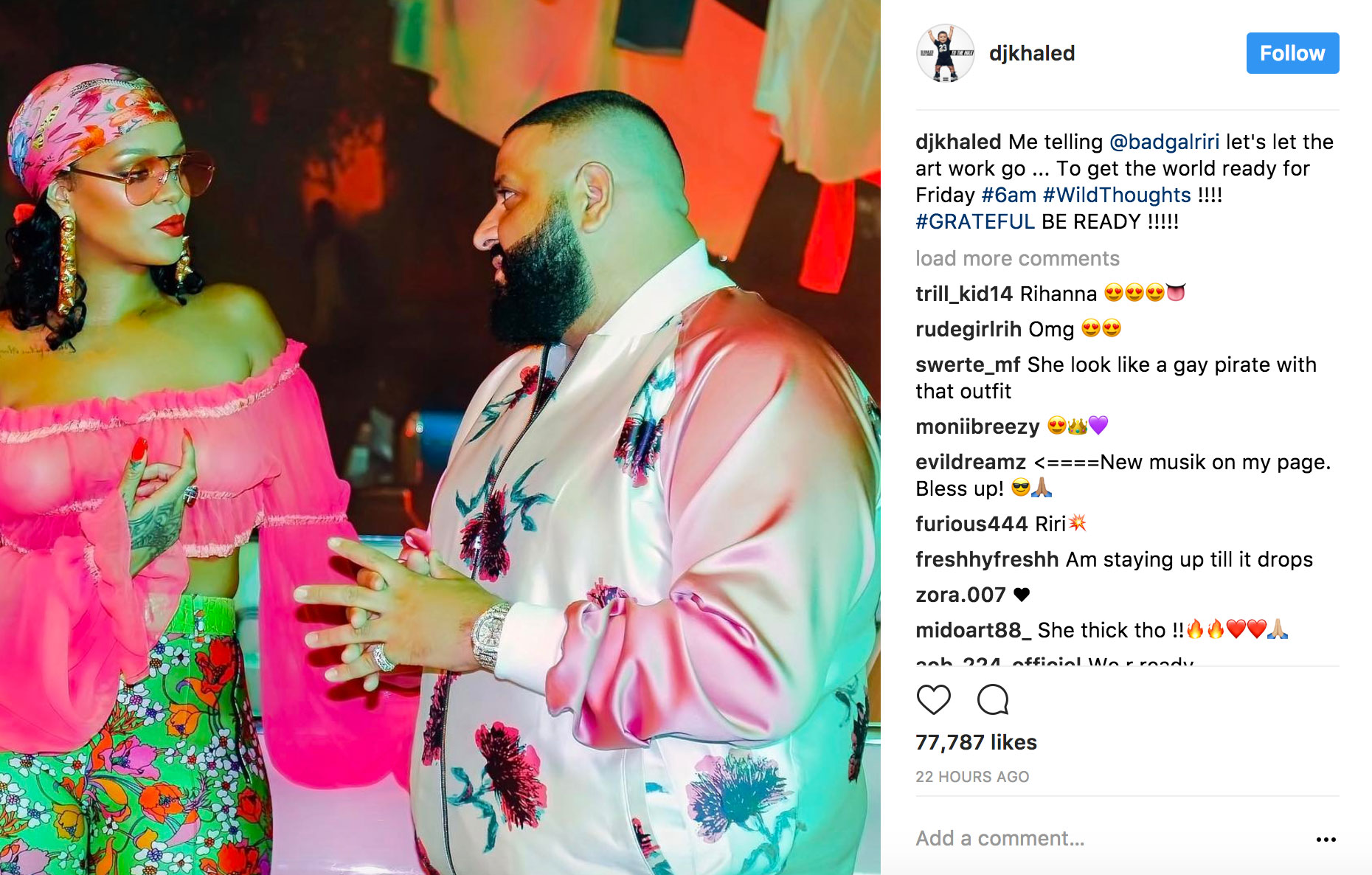 Despite all of the all-star recording artists DJ Khaled has worked with over the years, "Wild Thoughts" marks his first collaboration with Rihanna, believe it or not. In a recent interview on Entertainment Weekly: The Show, the mogul said: