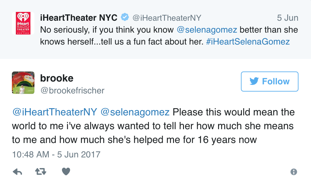 We posted a question to all of the Selenators in the Twitterverse, and asked who knows the most about Selena. Being one of her biggest fans, Brooke from New York City immediately replied (during school might we add) with a plethora of facts, such as her favorite food (pickles), what she likes to dip her french fries in (pickle juice), about her production company, her mom's production company, named all of the members of her glam squad, where her first kiss was, and a ton more. She knows pretty much everything. As she put it, "I know literally everything (but in the least creepy way possible)."