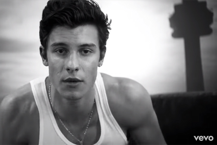 The video shows Mendes in a near-empty warehouse in front of a silhouette of the iconic CN Tower, playing on a grand piano, laying in bed (with a woman!), and running on a treadmill. At one point, a choir shows up.
